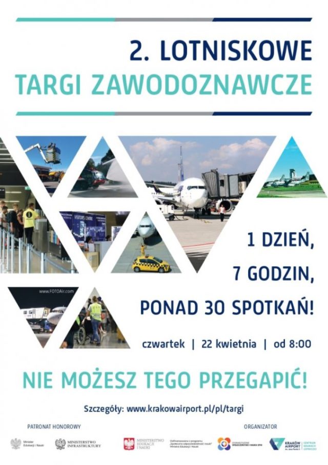 W imieniu Centrum Edukacji Lotniczej Kraków Airport chcieliśmy zaprosić do udziału w 2. Lotniskowych Targach Zawodoznawczych, które odbędą się 22 kwietnia br. Tym razem, w związku z obowiązującymi obostrzeniami, targi odbędą się w wersji zdalnej.