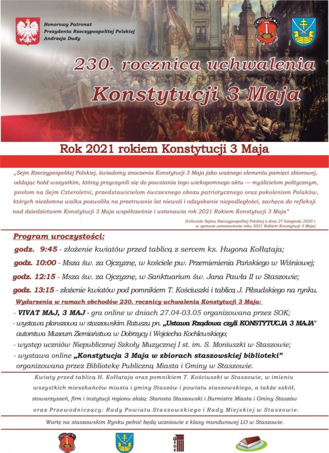 W tym roku obchodzimy to narodowe święto w warunkach szczególnych, w warunkach przedłużającego się stanu epidemii, która uniemożliwia publiczne zgromadzenia, jak to miało miejsce w latach poprzednich. Obchody Święta Konstytucji rozpoczniemy mszą świętą w kościele pw. Przemienienia Pańskiego w Wiśniowej i złożeniem kwiatów przed tablicą z sercem Hugo Kołłątaja. Następnie, po mszy świętej w Sanktuarium św. Jana Pawła II, odprawionej w intencji Ojczyzny i zakończenia pandemii, złożymy kwiaty przed pomnikiem Tadeusza Kościuszki oraz tablicą marszałka Józefa Piłsudskiego na staszowskim Rynku.