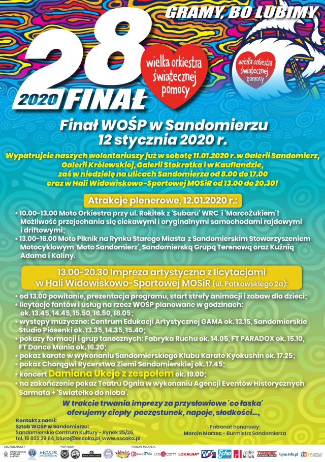 Serdecznie zapraszamy na 28. Finał Wielkiej Orkiestry Świątecznej Pomocy, który odbędzie się 12 stycznia 2020 r. Atrakcje pojawią się przy tej okazji zarówno w Hali Widowiskowo-Sportowej MOSiR przy Patkowskiego 2a oraz na Rynku Starego Miasta, a także na terenie ul. Rokitek i przyległym. Wolontariusze tego dnia będą kwestować także na ulicach Sandomierza od 8.00 do 17.00.