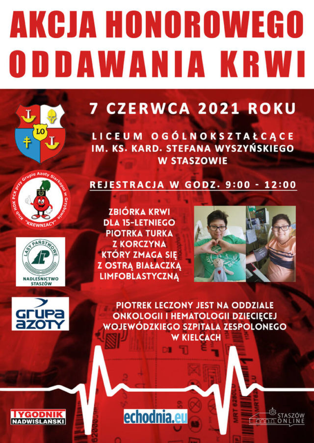 W poniedziałek 7 czerwca 2021 r. akcja honorowego krwiodawstwa wyjątkowo odbędzie się w Liceum Ogólnokształcącym im. ks. kard. Stefana Wyszyńskiego, a nie w staszowskim Ratuszu. Rejestracja krwiodawców w budynku liceum potrwa od godz. 9:00 do godz. 12:00.