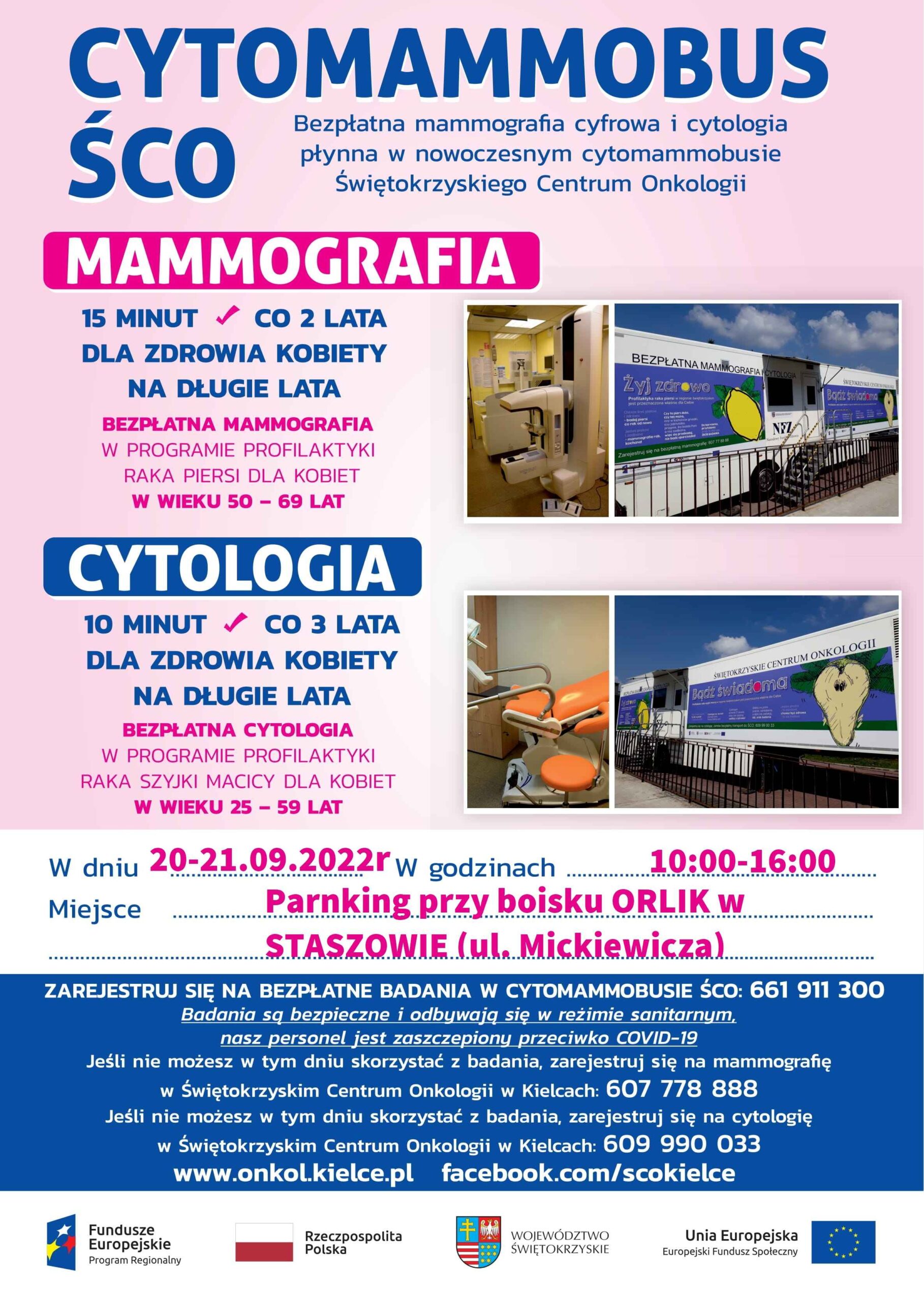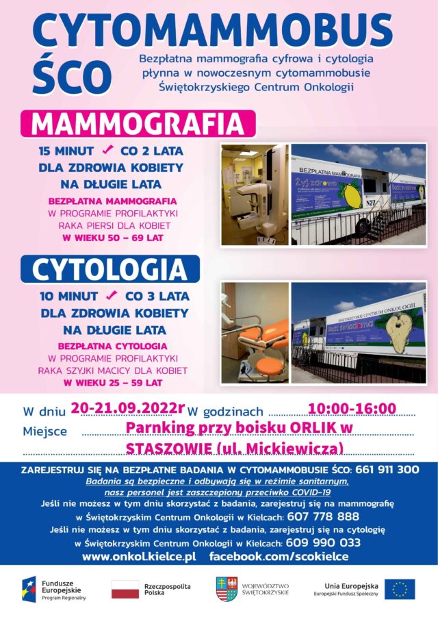 Świętokrzyskie Centrum Onkologii zaprasza Panie na bezpłatne badania mammograficzne i cytologiczne. Badania będzie można wykonać w nowoczesnym cytomammobusie, który w dniach 20 – 21 września 2022 r., w godzinach od 10.00 do 16.00, będzie stacjonował, na parkingu przy boisku „ORLIK” w Staszowie (ul. A. Mickiewicza). Zadzwoń i zarejestruj się! Tel. 661 911 300.