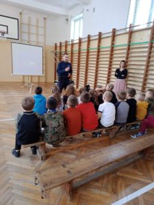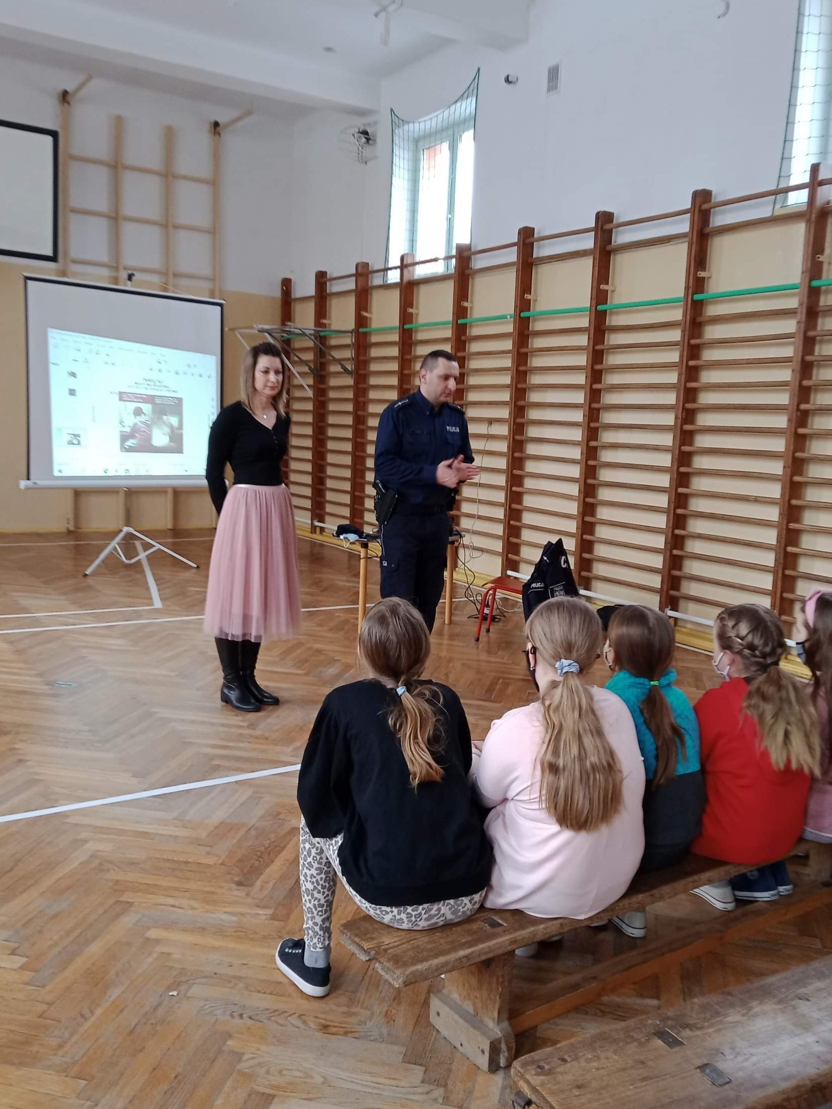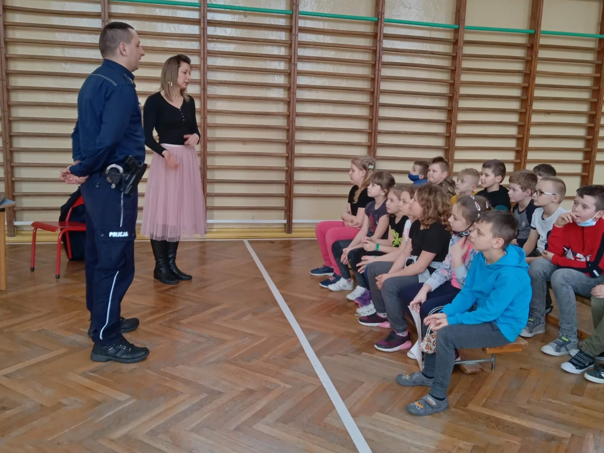 Na zaproszenie pani Weroniki Orzechowskiej policjant odwiedził uczniów z klas I-III. Każda z klas miała swoje indywidualne spotkanie z policjantem. Główny cel jaki przyświecał spotkaniom z uczniami to kształtowanie i promowanie prawidłowych postaw w zakresie bezpieczeństwa w internecie i przygotowanie uczniów do odpowiedzialnych zachowań w różnych sytuacjach. W trakcie spotkań z młodszymi uczniami policjant omówił przykłady nieodpowiedzialnych zachowań w sieci na podstawie prezentacji multimedialnej. Przestrzegał, że obdarzenie zaufaniem osób poznanych w sieci może przynieść bardzo negatywne skutki, uwrażliwiał na odpowiedzialne korzystanie z internetu i rozważne zamieszczanie wszelkich informacji czy fotografii na portalach internetowych.