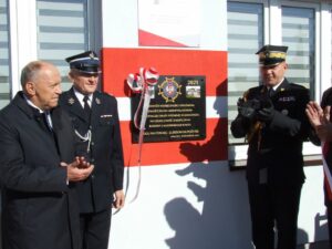 Poseł Zbigniew Chmielowiec i wicemarszałek Ewa Draus podkreślili w swoich wystąpieniach, jak ważną rolę w pomaganiu druhom z OSP w całym powiecie ma także starosta Jerzy Sudoł, który w skromnym powiatowym budżecie zawsze znajdzie pieniądze dla strażaków. Docenili to też strażacy obdarowując starostę pamiątkową statuetką.