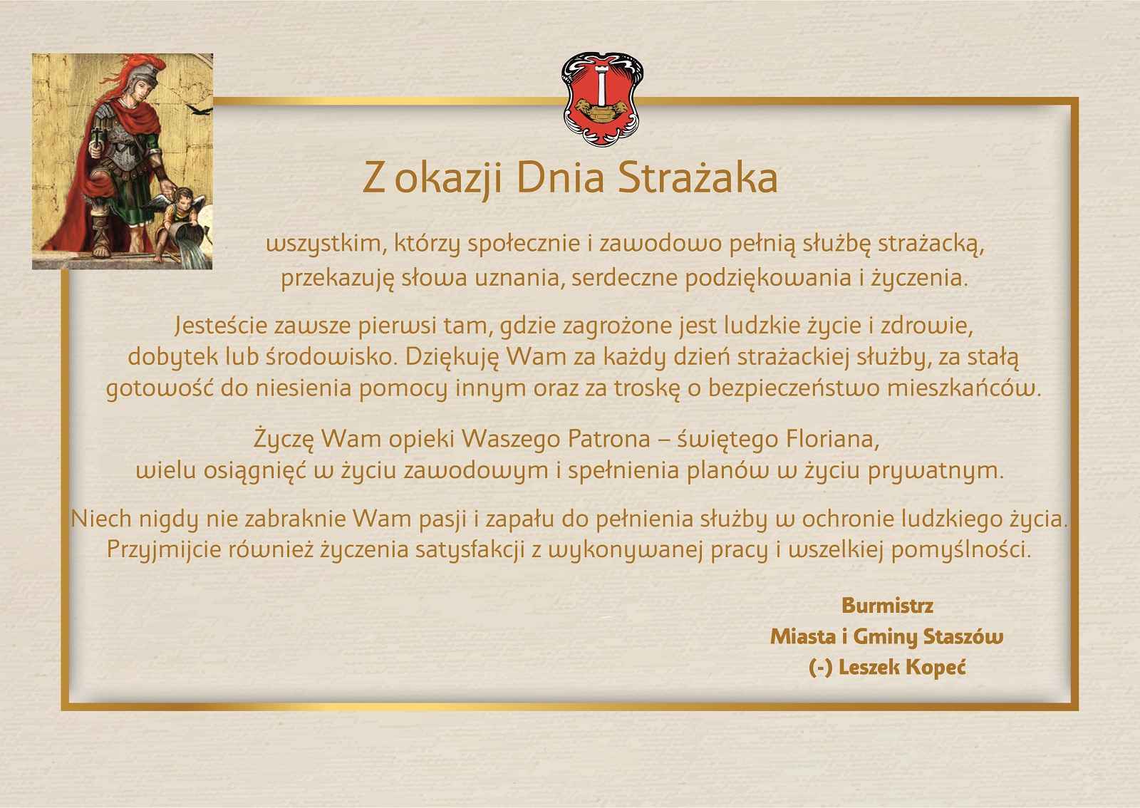 4 maja obchodzimy dzień św. Floriana – patrona Strażaków. Z tej okazji składamy serdeczne podziękowania strażakom z Państwowej Straży Pożarnej oraz druhnom i druhom z Ochotniczych Straży Pożarnych. Życzymy Wam wytrwałości i satysfakcji z pełnienia strażackiej służby oraz bezpiecznych powrotów z akcji.