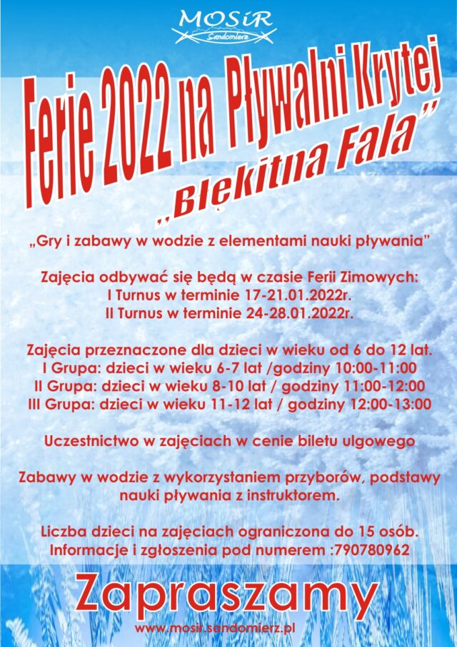 Strona główna POWIATY Ferie 2022 na Pływalni Krytej „Błękitna Fala”