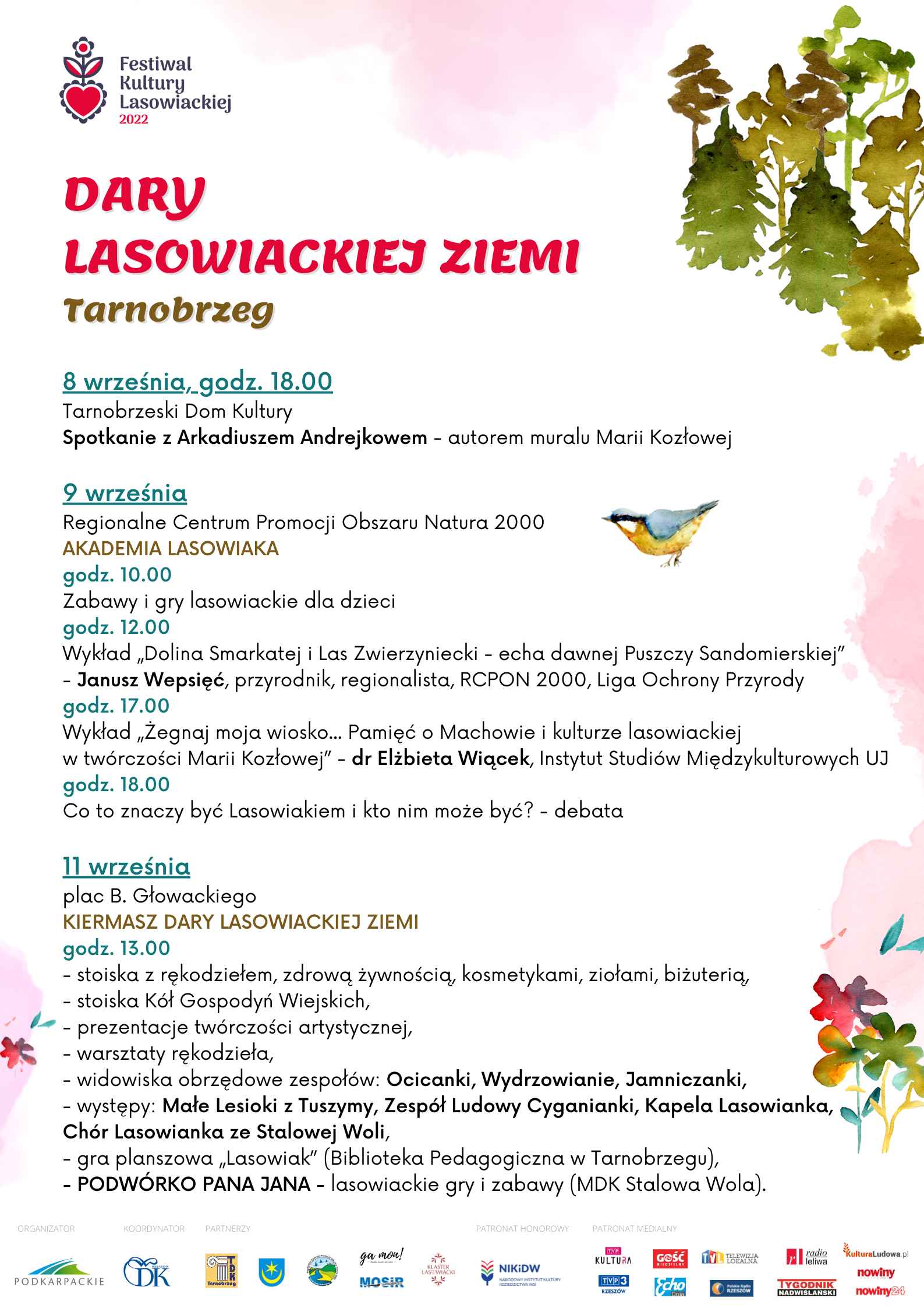W piątek 9 września w Centrum Natura 2000 ruszy Akademia Lasowiaka. Mali uczestnicy dowiedzą się kim byli Lasowiacy i wezmą udział w warsztatach plastycznych. Tego dnia będzie mieć też premierę książeczka „Jestem mały Lasowiaczek” z opowieścią o lasowiackim sercu, kolorowankami, łamigłówkami i kompendium wiedzy o Lasowiakach. W południe odbędzie się wykład dla młodzieży i dorosłych. Janusz Wepsięć – przyrodnik i regionalista opowie o rzece Smarkatej i Lesie Zwierzynieckim jako echach dawnej Puszczy Sandomierskiej. Z kolei wieczorem dr Elżbieta Wiącek z Instytutu Studiów Międzykulturowych UJ wygłosi wykład pt. „Żegnaj moja wiosko… Pamięć o Machowie i kulturze lasowiackiej w twórczości Marii Kozłowej”. Dzień zakończy debata o tym co to znaczy dzisiaj być Lasowiakiem i kto nim jest.