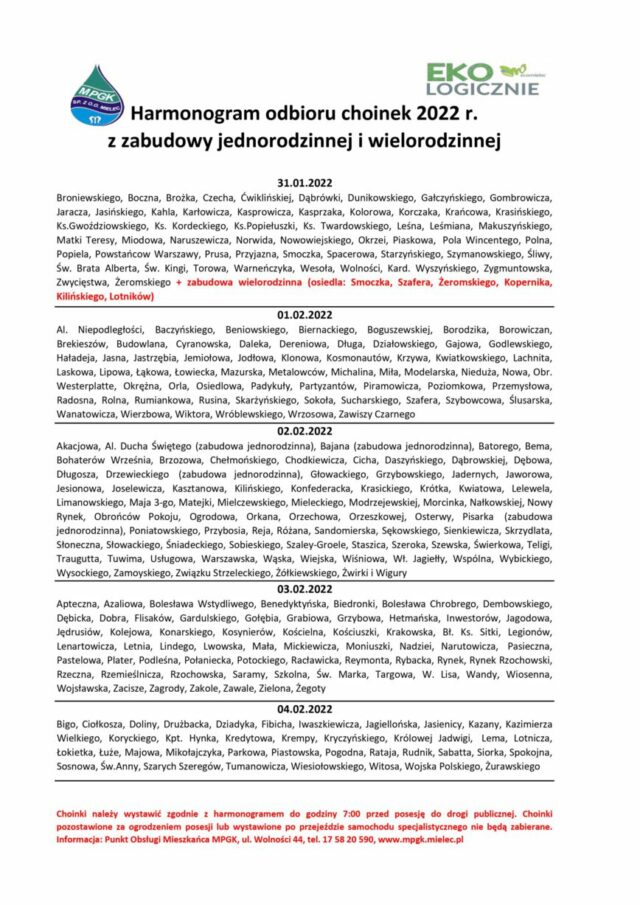 Strona główna POWIATY mielecki Harmonogram odbioru choinek