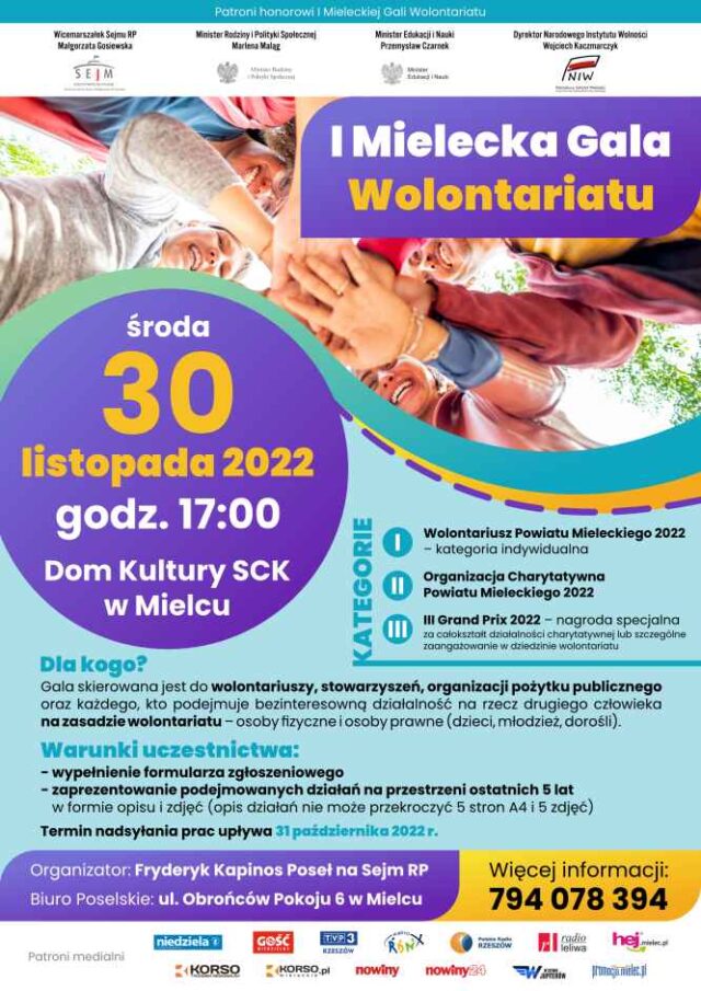 Zgłoś się na I Mielecką Galę Wolontariatu, której głównym celem jest docenienie działalności wolontariuszy, stowarzyszeń, organizacji pożytku publicznego oraz każdego kto podejmuje bezinteresowną działalność na rzecz drugiego człowieka na zasadzie wolontariatu – osoby fizyczne i osoby prawny (dzieci, młodzież, dorośli).