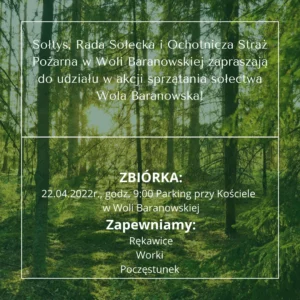 Warto wspomnieć, że w tym roku do akcji dołączy również Sołectwo Wola Baranowska! Tu akcję zaplanowano na 22.04.2022r. (piątek) od godziny 9:00 oraz Sołectwo Suchorzów w dniu 21.04.2022r. (czwartek) od godziny 16:00.