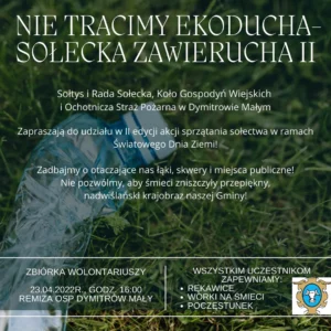 Po ubiegłorocznej, zakończonej sukcesem akcji pn. ,,Nie tracimy Ekoucha – Sołecka Zawierucha” w Dymitrowie Małym organizatorzy zapraszają do udziału w II edycji wielkiego sprzątania miejscowości, która odbędzie się już w najbliższą sobotę 23 kwietnia 2022r. od godz. 16:00. Dzięki temu po raz kolejny zadbamy o estetykę otaczającego nas środowiska, a otaczające nas łąki, lasy, skwery, nadwiślańska kępa nie będą tonąć w śmieciach!