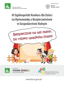 Zapraszamy dzieci rolników ubezpieczonych w KRUS do udziału w III Ogólnopolskim Konkursie dla Dzieci na Rymowankę o Bezpieczeństwie w Gospodarstwie Rolnym pod hasłem „Bezpiecznie na wsi mamy, bo ryzyko upadków znamy”. Patronat Honorowy nad konkursem sprawuje Minister Edukacji i Nauki Przemysław Czarnek.