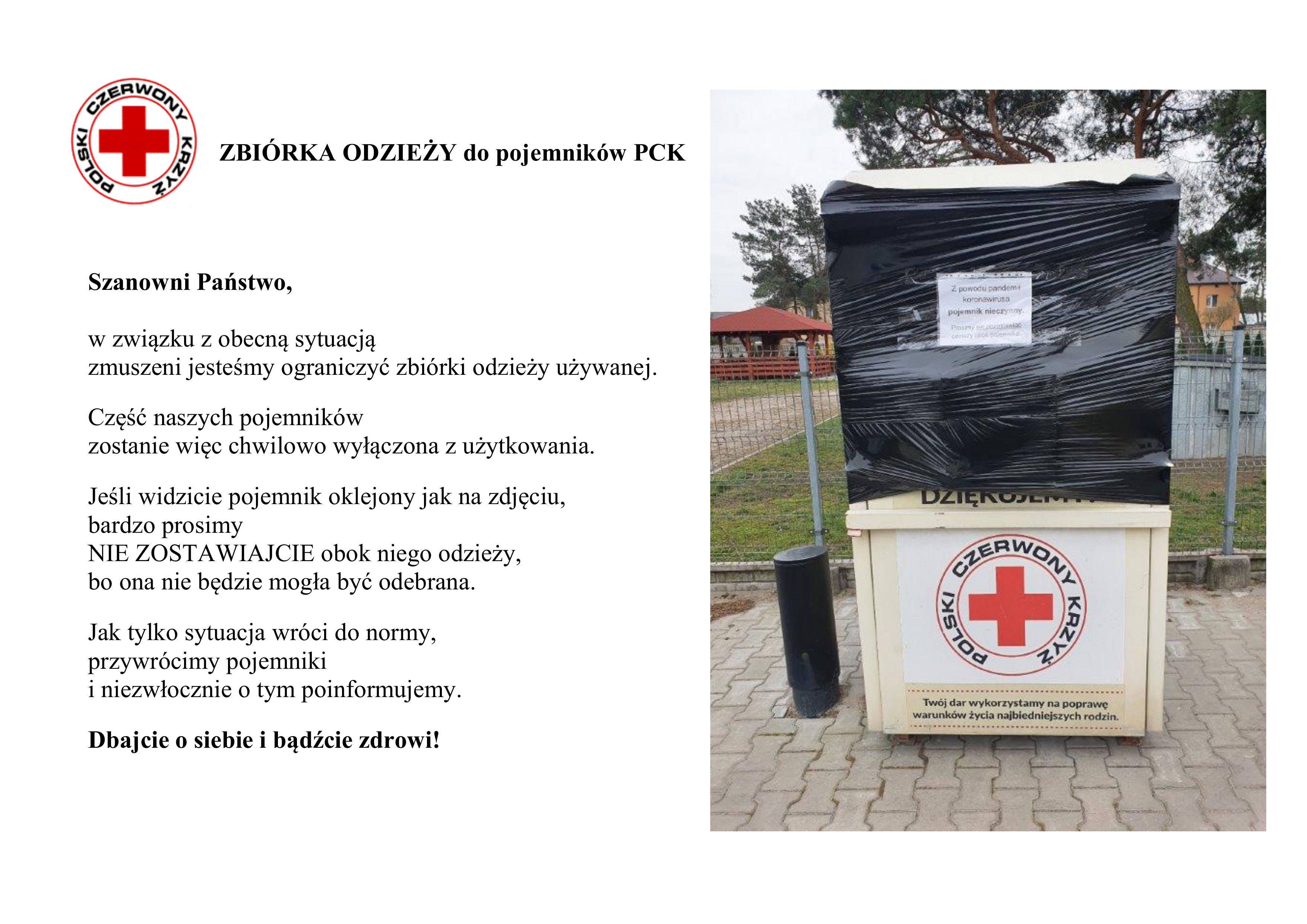 Informacja w sprawie zbiórek odzieży używanej – szczegóły znajdują się na plakacie.