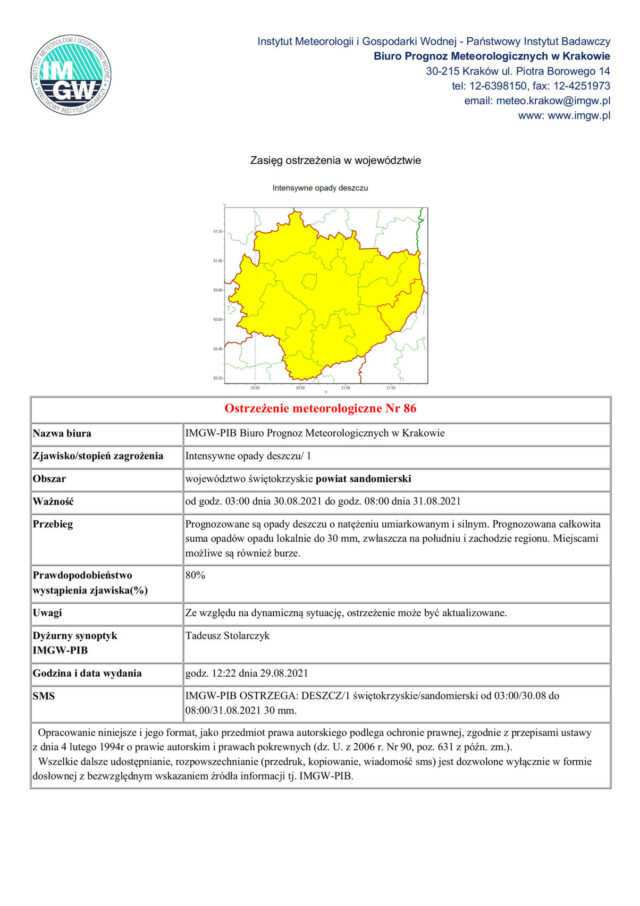 Od godz. 03:00 dnia 30.08.2021 do godz. 08:00 dnia 31.08.2021 r. prognozowane są opady deszczu o natężeniu umiarkowanym i silnym. Prognozowana całkowita suma opadów opadu lokalnie do 30 mm, zwłaszcza na południu i zachodzie regionu. Miejscami możliwe są również burze.