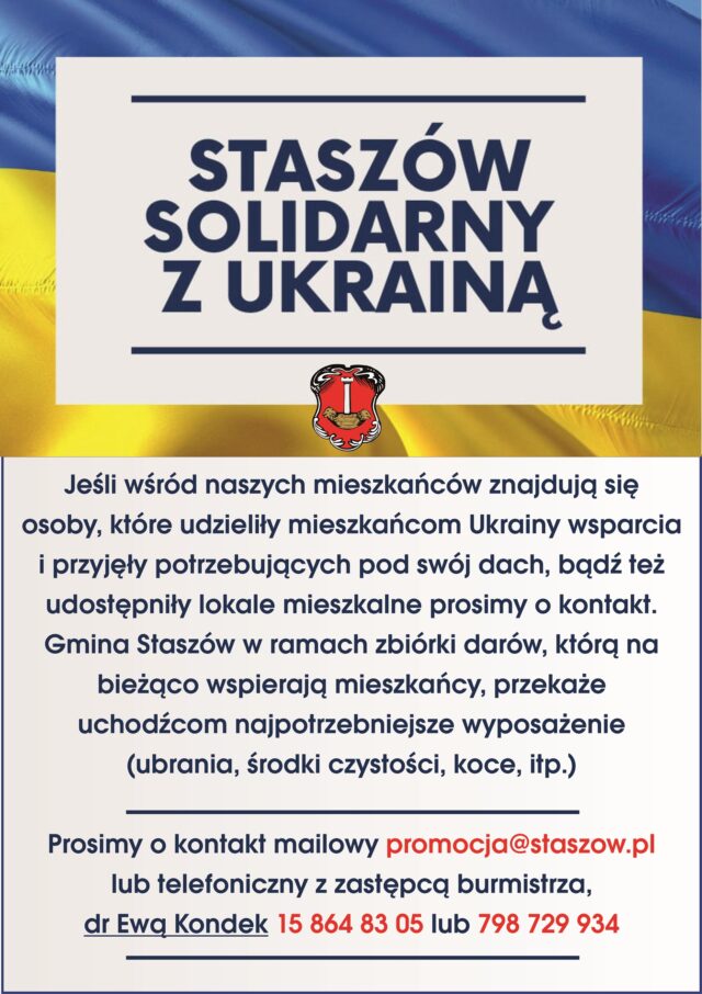 Jeśli wśród naszych mieszkańców znajdują się osoby, które udzieliły mieszkańcom Ukrainy wsparcia i przyjęły potrzebujących pod swój dach, bądź też udostępniły lokale mieszkalne prosimy o kontakt. Gmina Staszów w ramach zbiórki darów, którą na bieżąco wspierają mieszkańcy, przekaże uchodźcom najpotrzebniejsze wyposażenie (ubrania, środki czystości, koce, itp.)