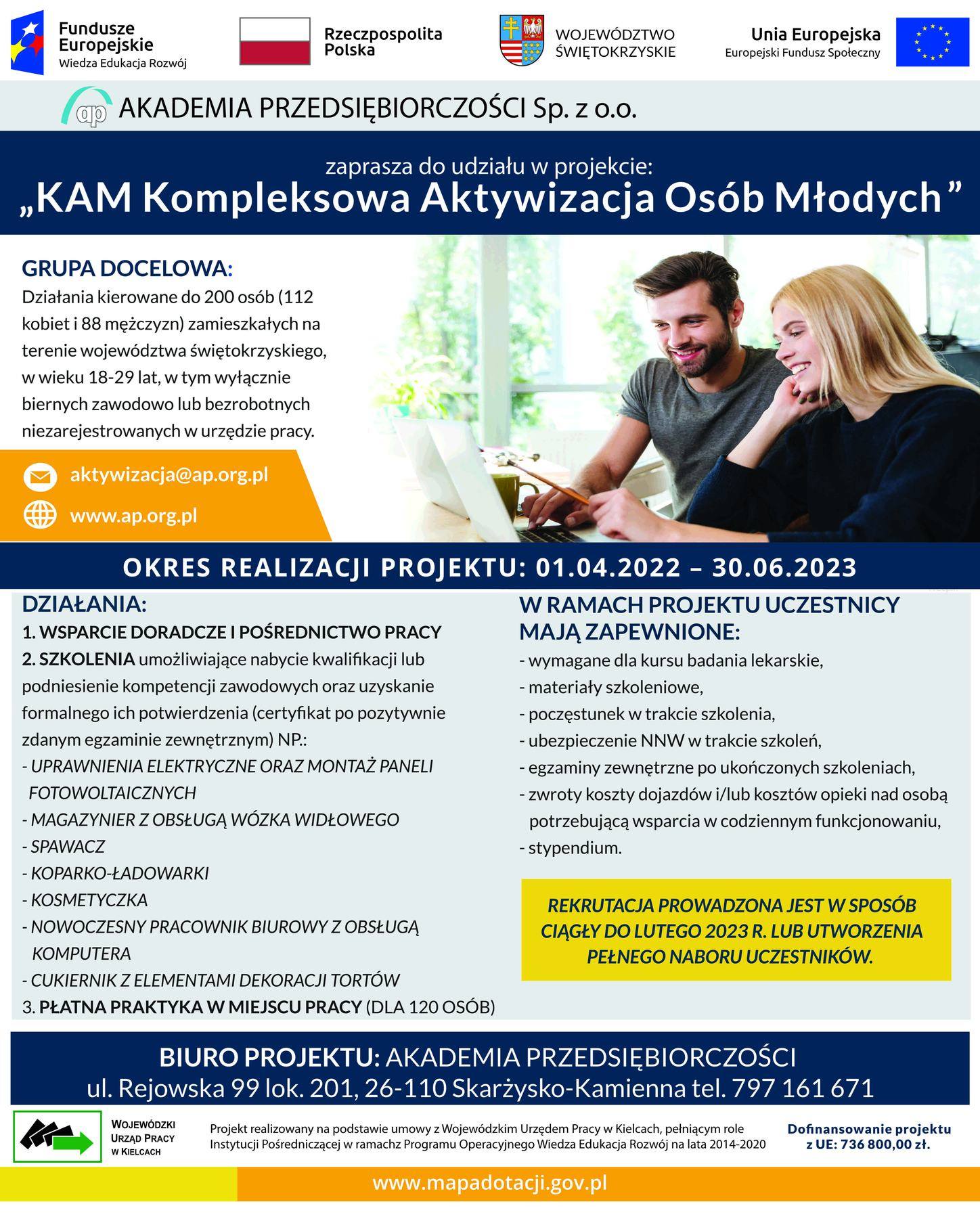 Akademia Przedsiębiorczości sp. z o. o. rozpoczęła realizację projektu „KAM Kompleksowa Aktywizacja Osób Młodych” projekt realizowany jest w ramach Programu Operacyjnego Wiedza Edukacja Rozwój 2014-2020. na podstawie umowy nr POWR.01.02.01-26-0010/21 z Wojewódzkim Urzędem Pracy w Kielcach.