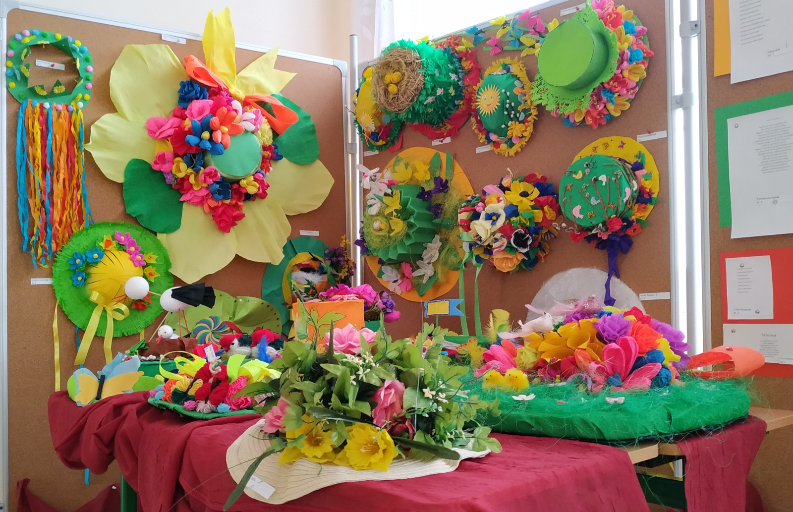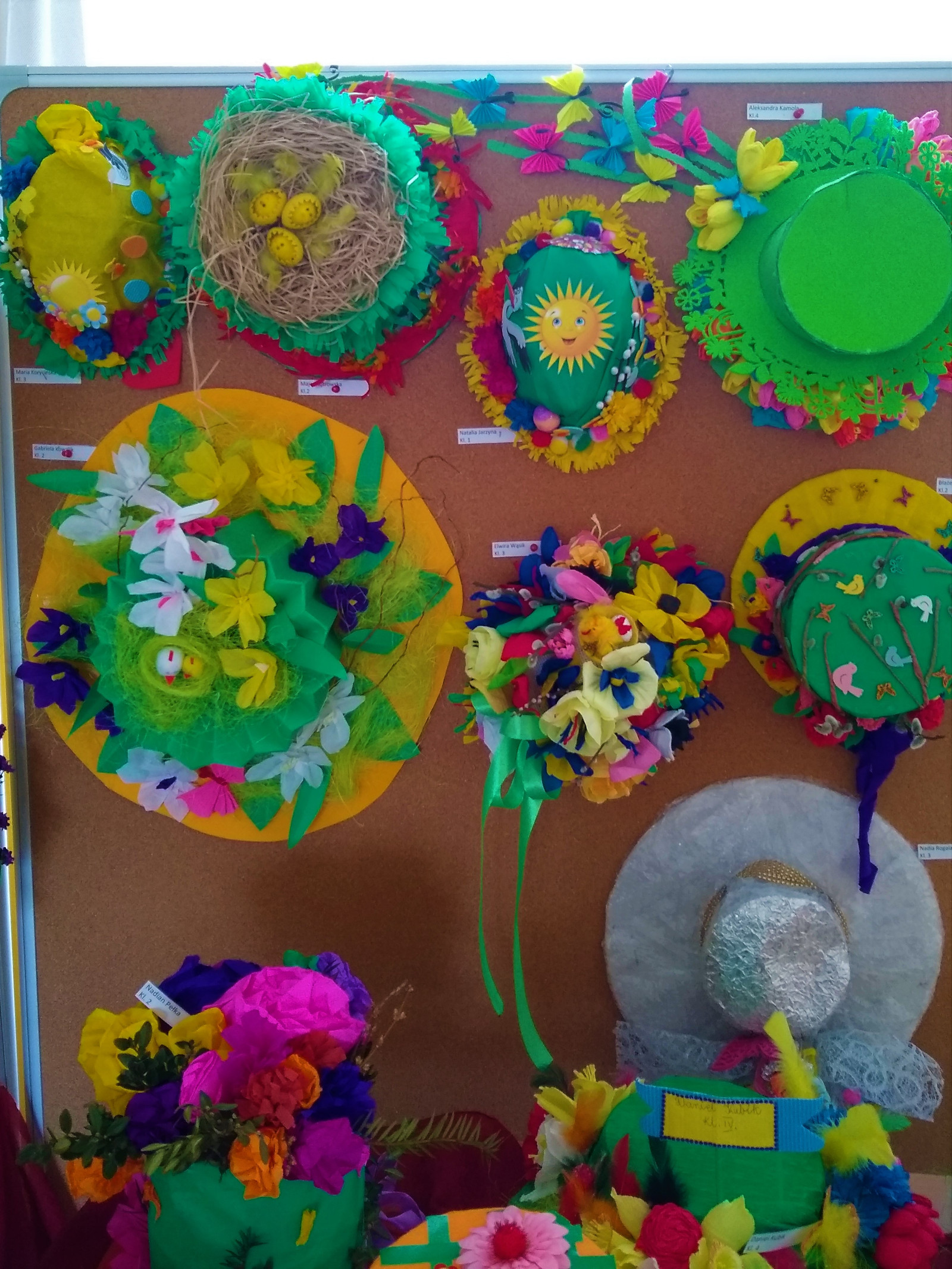 Efekt obu konkursów przeszedł nasze najśmielsze oczekiwania. Nasi uczniowie okazali się bardzo wrażliwymi, kreatywnymi osóbkami. Kapelusze, jakie dotarły do szkoły, wyglądają przepięknie. Czego na nich nie ma? Kwiatki, ptaszki, piórka, żaby, biedronki, bocianie gniazdo, staw… .Kaskada barw i kolorów! I wszystko to rękodzieło. Coś wspaniałego!.
