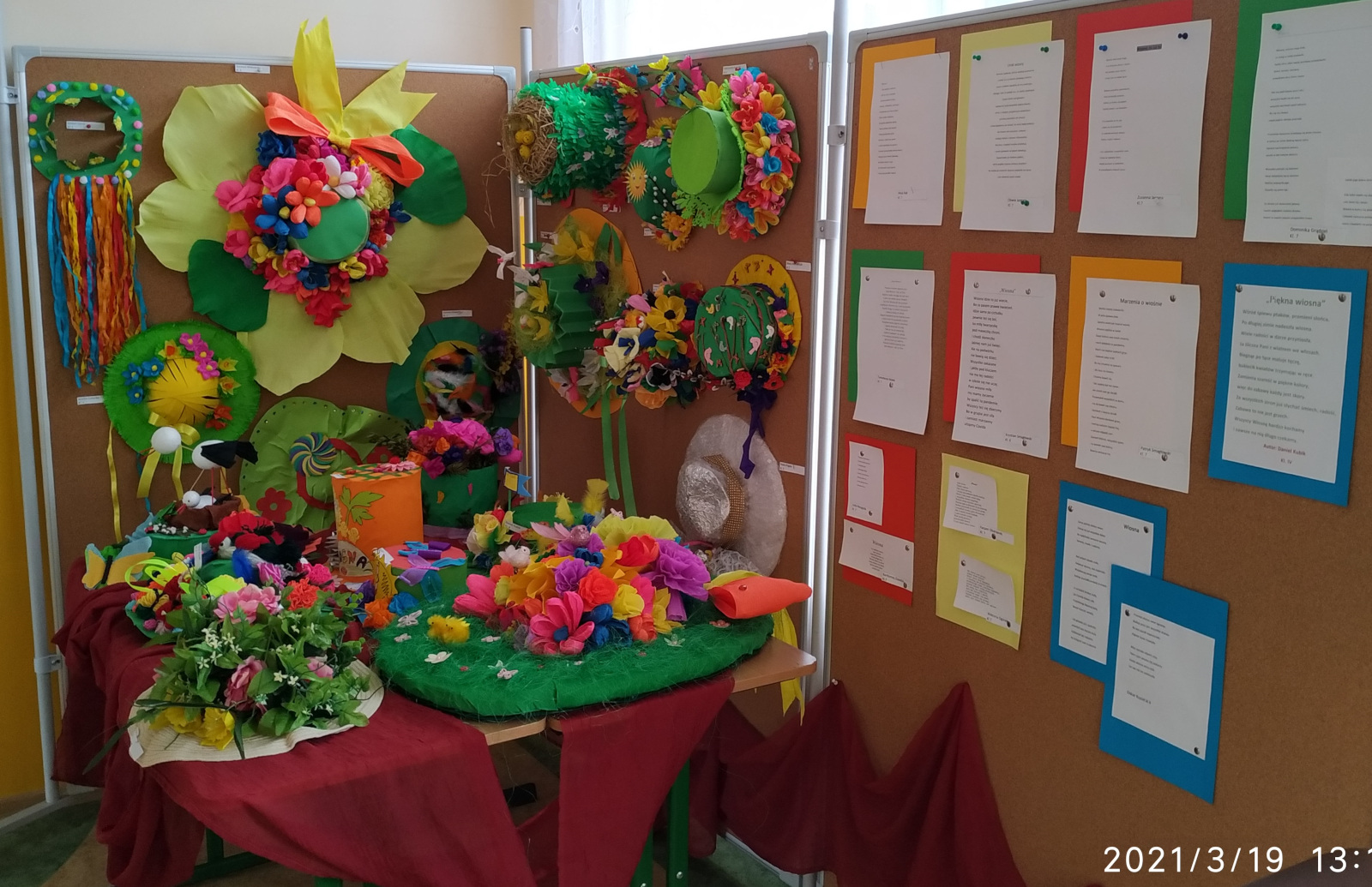 Z okazji Pierwszego Dnia Wiosny ogłosiliśmy dwa konkursy – zadaniem uczniów klas 1 – 3 było zrobienie kapelusza Pani Wiosny, natomiast uczniowie klas 4 – 8 mieli za zadnie napisać wiersz o wiośnie. Klasa 4 miała wybór, które zadanie chce wykonać.