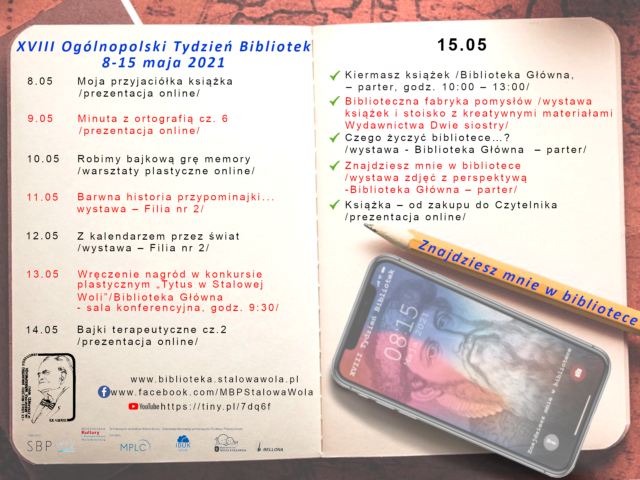 Hasłem przewodnim wydarzeń bibliotecznych w tysiącach bibliotek w całej Polsce jest zapewnienie – „Znajdziesz mnie w bibliotece”. Motto można odnieść zarówno do fizycznej obecności w realnej przestrzeni bibliotecznej jak i do działalności bibliotek online, do ich cyfrowych zasobów i wydarzeń, do których docieramy poprzez strony internetowe bibliotek, portale internetowe, media i komunikatory społecznościowe. Tegoroczna oferta obchodów święta bibliotek w MBP w Stalowej Woli zaprezentowana zostanie odbiorcom hybrydowo – w świecie realnym jak i wirtualnym. 8 maja będzie okazja do zapoznania się z prezentacją online pt. „Moja przyjaciółka książka”, kolejnego dnia Filia nr 1 przygotowała prezentację online z serii „Minuta z ortografią” . Filia nr 2 z kolei zaprasza w dniach 11 i 12 maja na dwie wystawy do obejrzenia już na żywo – w placówce przy ul. M. Siedlanowskiego 3 – „Z kalendarzem przez świat” oraz „Barwna historia przypominajki…”. 10 maja MBP zaprasza na warsztaty online, podczas których nauczymy się jak wykonać z materiałów plastycznych grę „Memory”.