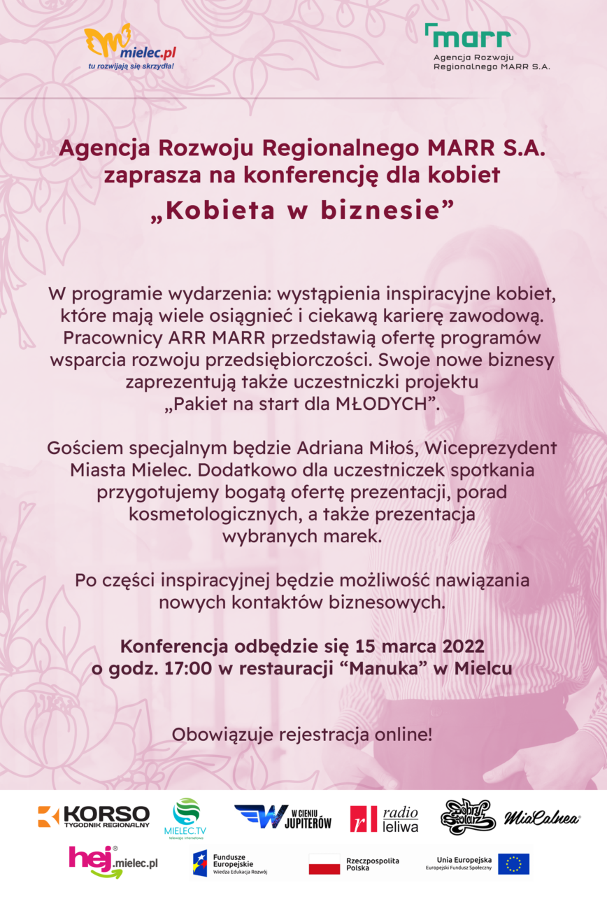 Agencja Rozwoju Regionalnego MARR S.A. zaprasza na konferencję dla kobiet “kobieta w biznesie”. Gościem specjalnym wydarzenia będzie Wiceprezydent Mielca Adriana Miłoś.