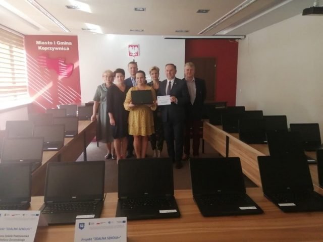 31 laptopów kupionych dzięki rządowemu programowi „Zdalna Szkoła Plus” burmistrz Koprzywnicy Aleksandra Klubińska przekazała w piątek, w obecności posła ziemi sandomierskiej Marka Kwitka dyrektorom czterech oświatowych placówek.Laptopy trafiły do Zespołu Placówek Oświatowych w Koprzywnicy, Szkoły Podstawowej w Niedźwicach, Szkoły Podstawowej w Postronnej i Szkoły Podstawowej w Gnieszowicach. Wartość sprzętu wyniosła 50 tysięcy złotych. Jak podkreśliła podczas przekazania sprzętu obecnie komputery pozostają na wyposażeniu szkół. Z chwilą wprowadzenia zdalnego nauczania, trafią do wskazanych przez dyrekcję uczniów.To już druga partia komputerów, jakie gmina Koprzywnica zakupiła dzięki wsparciu z rządowego programu „Zdalna Szkoła”. Poprzednim razem samorząd Koprzywnicy otrzymał na zakup sprzętu 60 tysięcy złotych. Udało się zakupić 30 komputerów.