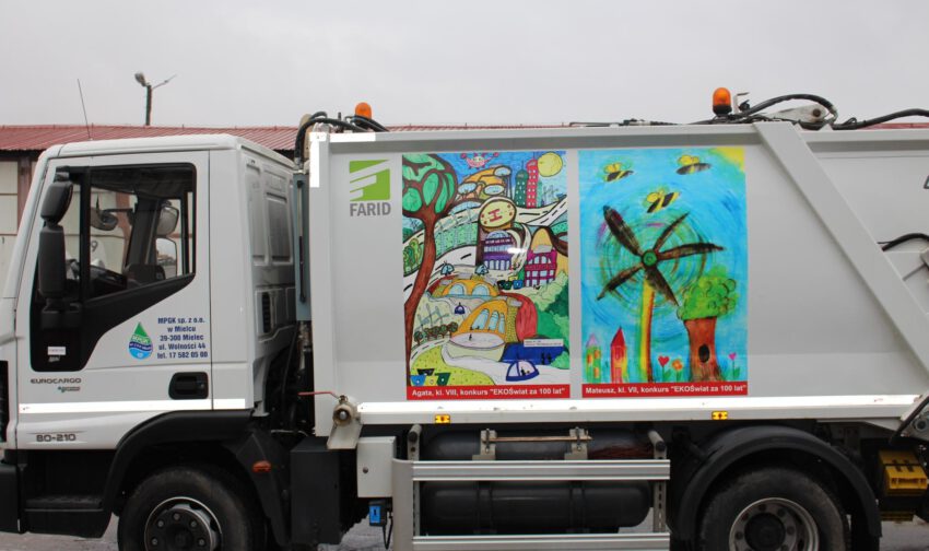 Od połowy stycznia na ulicach Mielca można spotkać śmieciarki oklejone pracami przygotowanymi przez uczniów szkół podstawowych w ramach konkursu „Ekoświat za 100 lat”.
