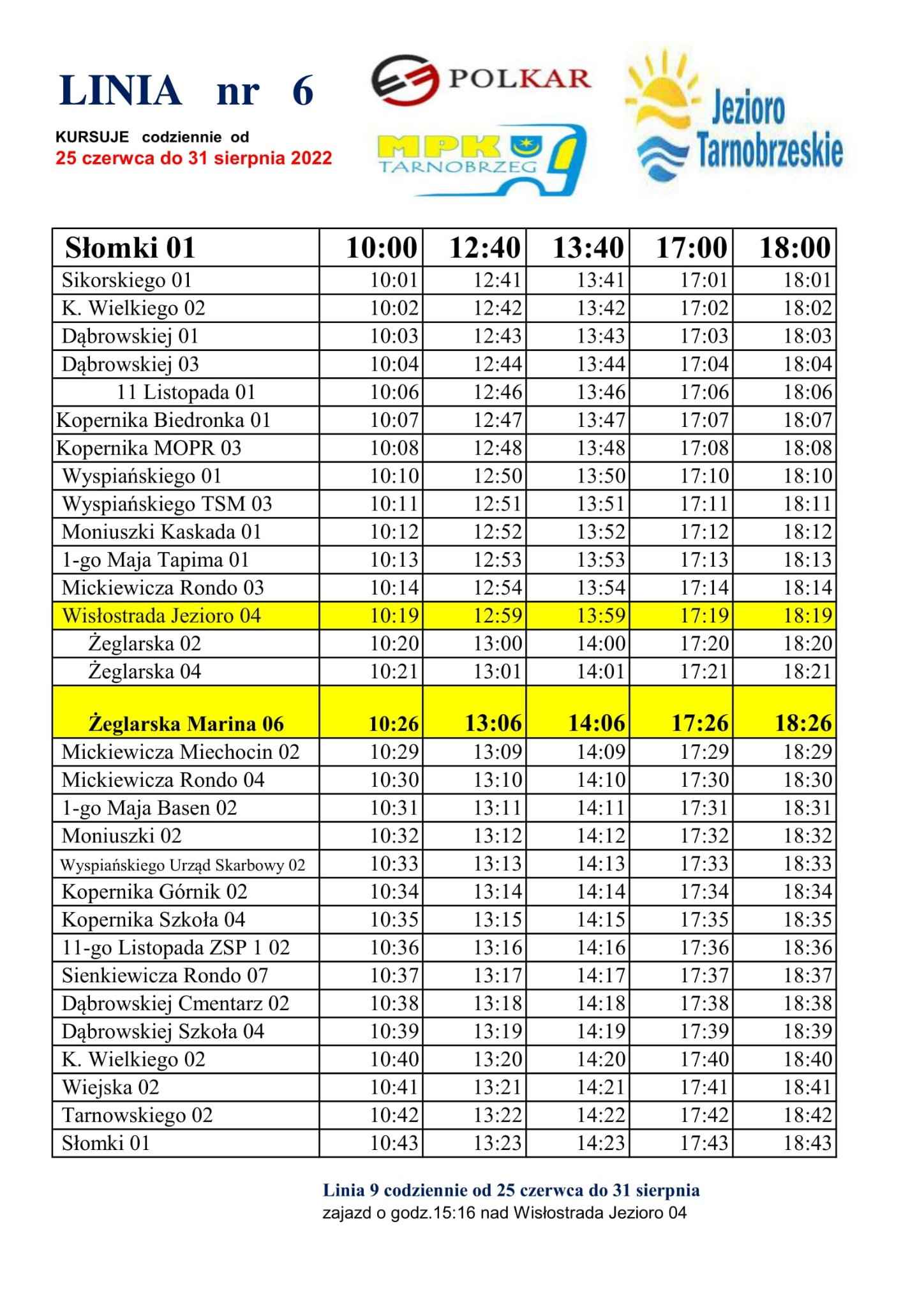 Informujemy , że od dnia 25 czerwca 2022 r. /sobota/ do 31 sierpnia 2021 r. włącznie /środa/ zostaje uruchomiona codzienna linia „6” nad Jezioro Tarnobrzeskie.