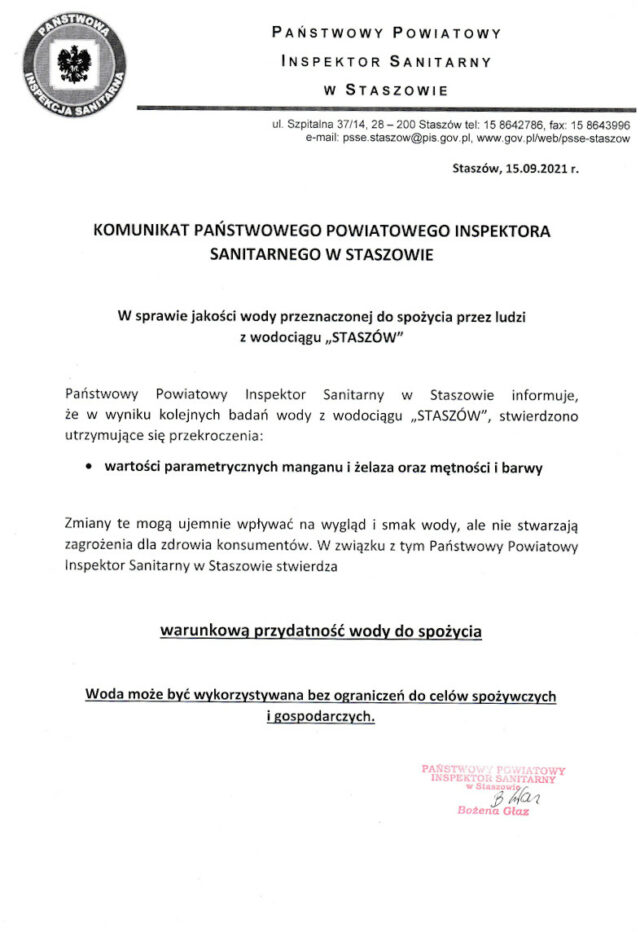 Komunikat w sprawie przydatności wody do spożycia.