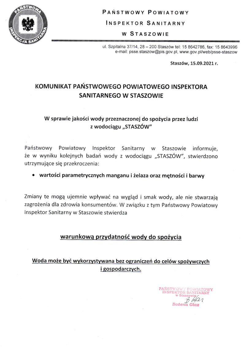 Komunikat w sprawie przydatności wody do spożycia