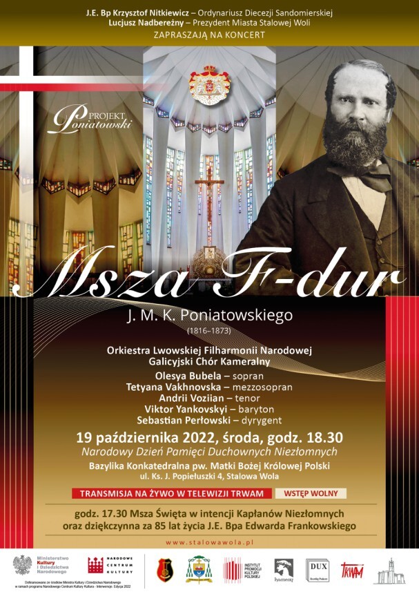 Z okazji Narodowego Dnia Pamięci Duchownych Niezłomnych J.E. Bp Krzysztof Nitkiewicz oraz Prezydent Miasta Stalowej Woli Lucjusz Nadbereżny  zapraszają na koncert Msza F-dur J. M. K. Poniatowskiego w wykonaniu: Orkiestry Lwowskiej Filharmonii Narodowej i Galicyjskiego Chóru Kameralnego.