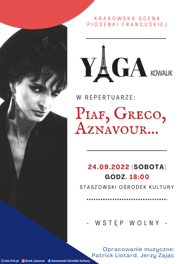 24 września o godzinie 18:00 w Staszowskim Ośrodku Kultury odbędzie się koncert pt. „Piaf, Greco, Aznavour” w wykonaniu Yagi Kowalik.