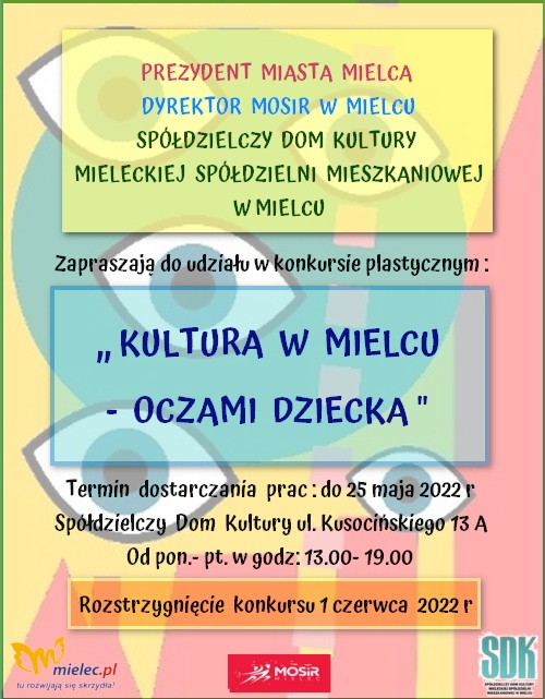 Prezydent Miasta Mielca, Dyrektor MOSiR Mielec oraz Spółdzielczy Dom Kultury Mieleckiej Spółdzielni Mieszkaniowej w Mielcu zapraszają do udziału w konkursie plastycznym KULTURA w Mielcu – Oczami Dziecka”.
