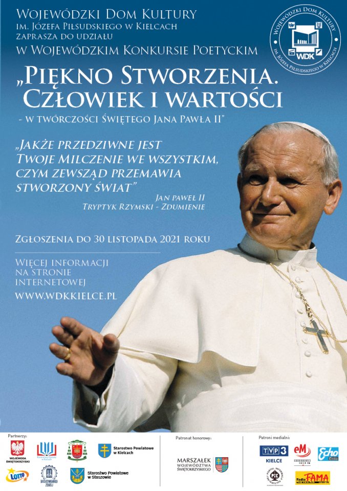 Wojewódzki Dom Kultury im. Józefa Piłsudskiego w Kielcach i Kuria Diecezjalna w Kielcach. Wydział Katechetyczny zapraszają Państwa do udziału w Wojewódzkim Konkursie Literackim „Piękno stworzenia. Człowiek i wartości w twórczości Świętego Jana Pawła II”. Prace konkursowe można nadsyłać do 30 listopada 2021 r.
