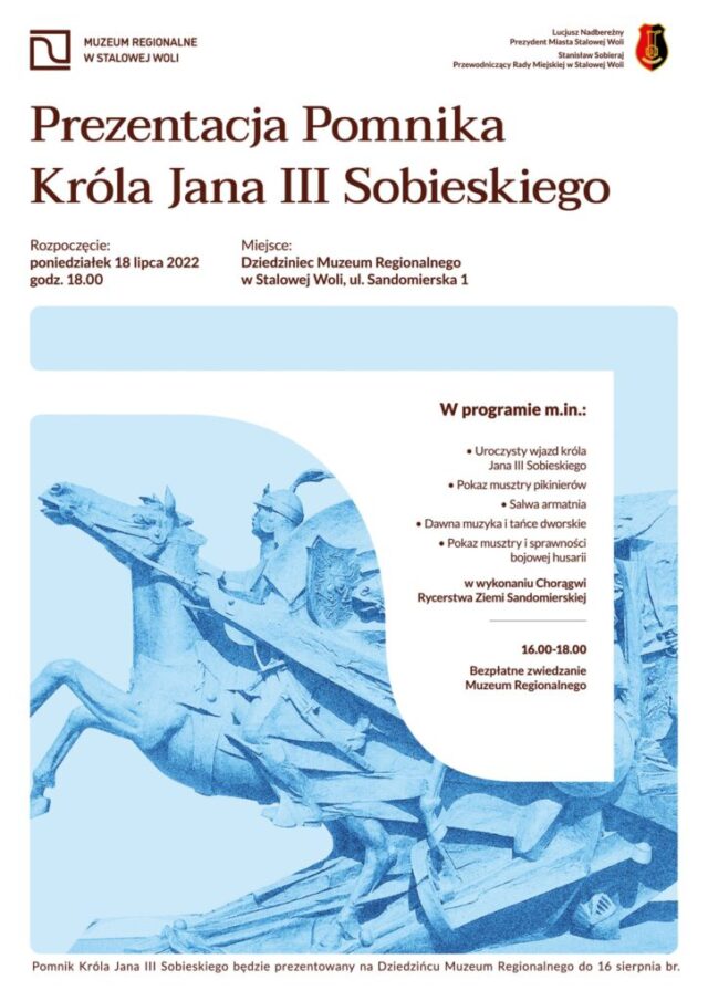Już w najbliższy poniedziałek 18 lipca o godz.18:00 przed budynkiem Muzeum Regionalnego w Stalowej woli przy ul. Sandomierskiej 1 zostanie zaprezentowany pomnik króla Jana III Sobieskiego. Uroczystość uświetni Chorągiew Rycerstwa Ziemi Sandomierskiej, która zaprezentuje m.in. paradę wojsk, pokazy konne oraz taniec i muzykę dworską. Tego dnia w godz. 6.00-18.00 bezpłatnie będzie można także zwiedzić muzeum.