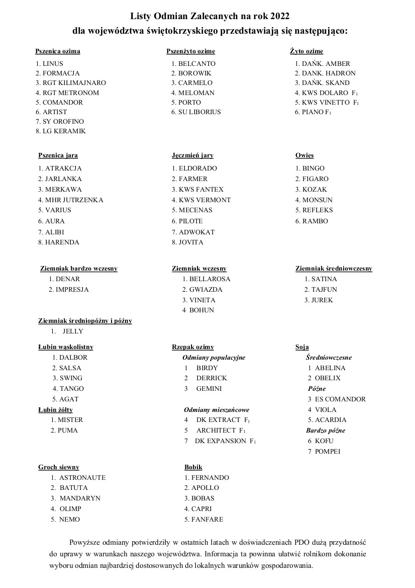Lista Zalecanych Odmian (LZO) do uprawy na obszarze województwa świętokrzyskiego na rok 2022 dla pszenicy ozimej, pszenicy jarej, pszenżyta ozimego, żyta ozimego, jęczmienia jarego, owsa, ziemniaków: bardzo wczesnych, wczesnych, średniowczesnych i średniopóźnych, łubinu wąskolistnego, łubinu żółtego, rzepaku ozimego i odmian mieszańcowych, grochu siewnego, bobiku i soi.