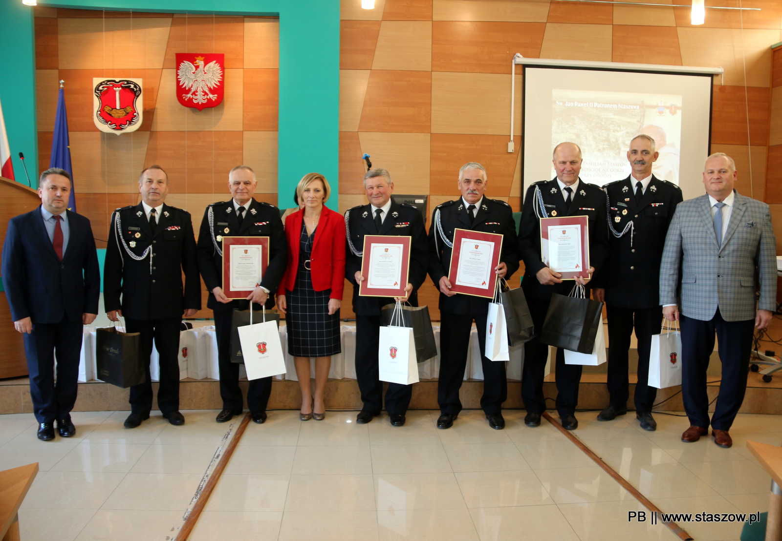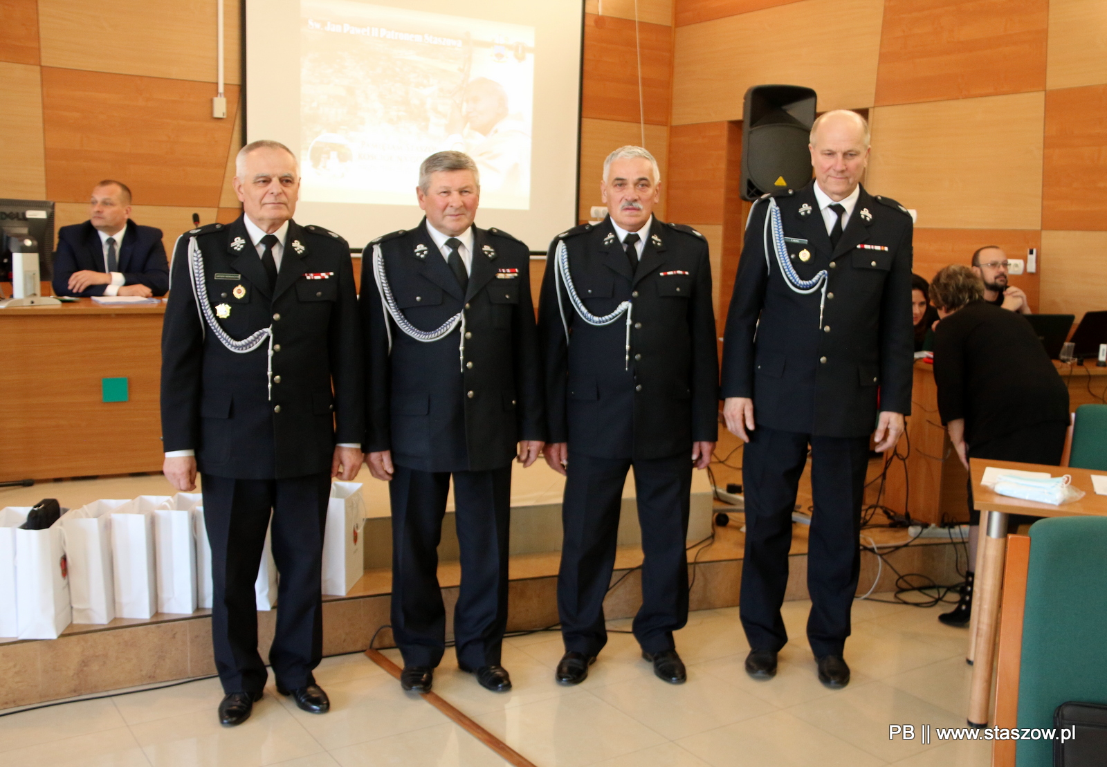 Przed rozpoczęciem LVI Sesji Rady Miejskiej w Staszowie Leszek Kopeć, Burmistrz Miasta i Gminy Staszów złożył członkom Prezydium Zarządu OSP RP w Staszowie podziękowania za wieloletnią służbę na rzecz lokalnej społeczności. Życzenia, gratulacje oraz upominki z rąk burmistrza Leszka Kopcia, jego zastępcy, dr Ewy Kondek, oraz przewodniczącego Rady Miejskiej, Ireneusza Kwiecjasza, odebrali druhowie: Kryspin Bednarczyk, Kazimierz Głodek, Marek Chojna oraz Zdzisław Sojka.