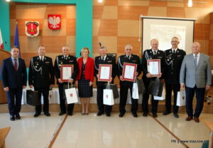 Włodarze pogratulowali objęcia stanowiska Prezesa Zarządu OSP RP w Staszowie Romanowi Myśliwcowi, a Grzegorzowi Kwietniewskiemu kolejnej kadencji jako Komendant Miejsko-Gminny w Staszowie i wręczyli im upominki.