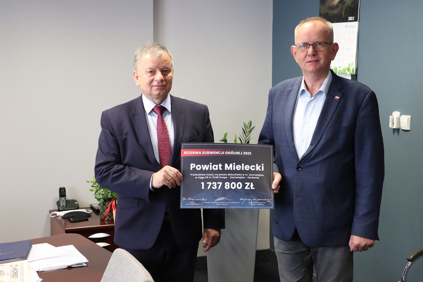 Poseł Fryderyk Kapinos przekazał bardzo dobrą wiadomość Staroście Powiatu Mieleckiego Stanisławowi Lonczakowi o dofinansowaniu budowy mostu w Zachwiejowie. Otrzymane dofinansowanie na kwotę 1 737 800 zł pochodzi z Rezerwy Ogólnej Subwencji.