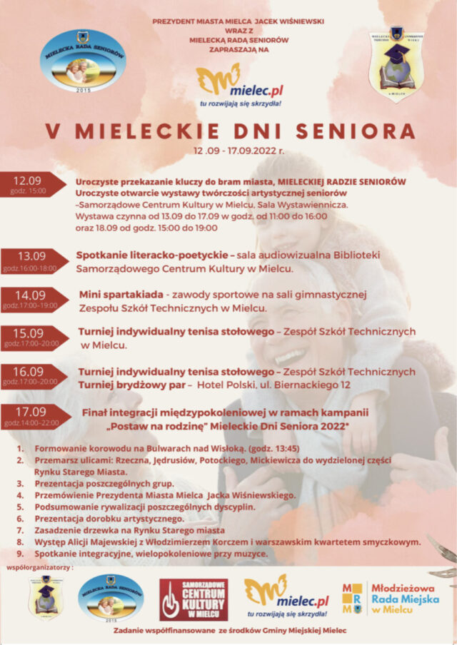 Najbliższe dni będą należeć do seniorów. W Mielcu już po raz piąty będą obchodzone Mieleckie Dni Seniora. Inicjatorem i organizatorem tych Dni są: Mielecka Rada Seniorów i Mielecki Uniwersytet III Wieku, przy wsparciu finansowym i doradczym Gminy Miejskiej Mielec. Dni Seniora to dowód na to, że seniorzy są ważną częścią miejskiej społeczności i mają wpływ na życie miasta, to również aktywizacja społeczna seniorów poprzez motywowanie do działań na rzecz swojego otoczenia.