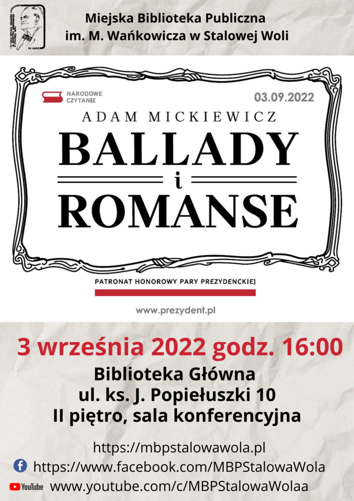Na „Ballady i Romanse” Adama Mickiewicza w ramach Narodowego Czytania już w najbliższą sobotę 3 września 2022 zaprasza do swojej głównej siedziby przy ul. Popiełuszki 10 Miejska Biblioteka Publiczna. Szczegóły poniżej.