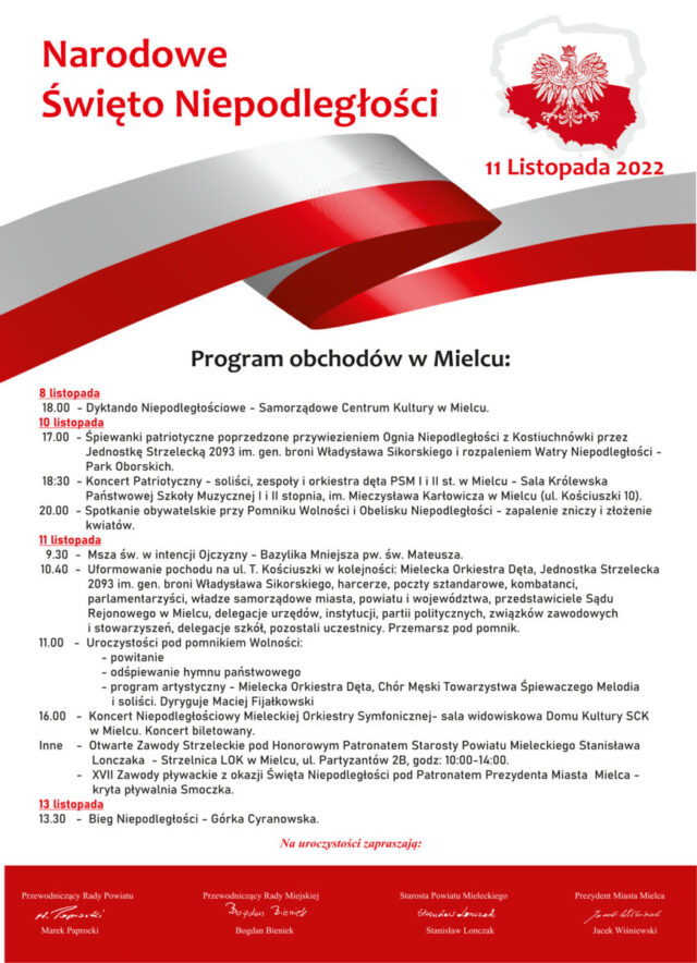 Narodowe Święto Niepodległości w Mielcu, to także szereg imprez towarzyszących. W piątek 11 listopada będą to Otwarte Zawody Strzeleckie pod Honorowym Patronatem Starosty Powiatu Mieleckiego Stanisława Lonczaka (godz. 10:00-14:00 – Strzelnica LOK w Mielcu), XVII Zawody Pływackie z okazji Święta Niepodległości pod Patronatem Prezydenta Miasta Mielca (kryta pływania Smoczka – sesja przedpołudniowa i popołudniowa od 15.00) oraz o godz. 16:00 – Koncert Niepodległościowy Mieleckiej Orkiestry Symfonicznej w sali widowiskowej Domu Kultury SCK w Mielcu (koncert biletowany).