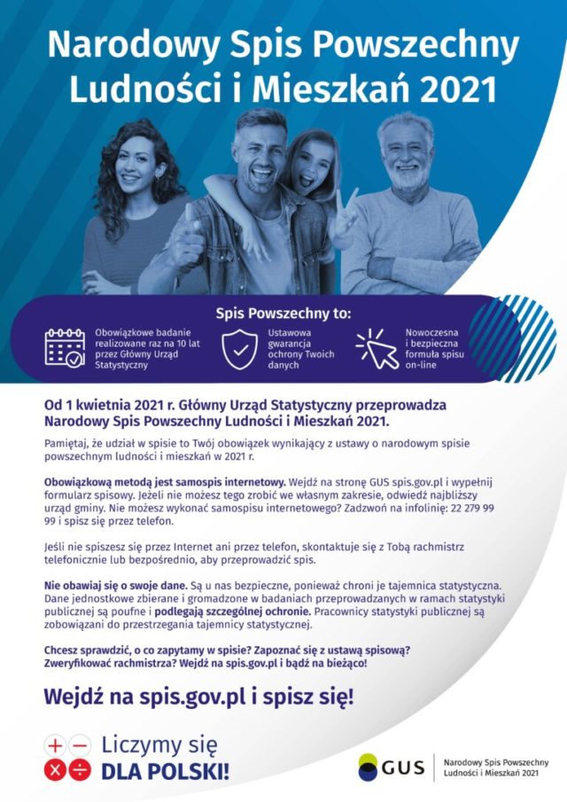 W dniu 1 kwietnia 2021 r., w całej Polsce, rozpocznie się Narodowy Spis Powszechny Ludności i Mieszkań 2021. Spis powszechny jest organizowany w odstępach 10-letnich. Jest on najważniejszym badaniem statystycznym nie tylko w Polsce, ale i w większości krajów w Europie i na świecie.