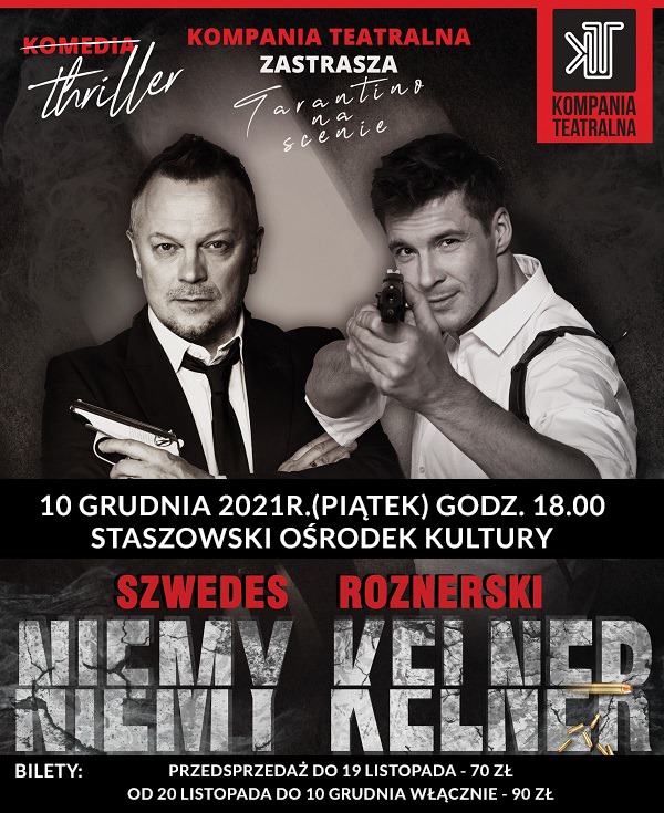 Para typów podejrzanego autoramentu to intrygujący motyw zarówno filmowy jak i literacki. U Becketta: Vladimir i Estragon, u Quentina Tarantino? A proszę, chociażby w Pulp Fiction: pamiętacie taniec Travolty, psalmy głoszone przez Samuela L. Jacksona, czy też zegarek skrzętnie przechowany w-i po- ojcu Bruce’a Willisa..? Tarantino odrobił lekcje… my je sprawdzamy… wy ocenicie… dzięki bohaterom Niemego Kelnera, Benowi i Gusowi, Tarantino przedarł się wreszcie na scenę, tu, w Polsce.