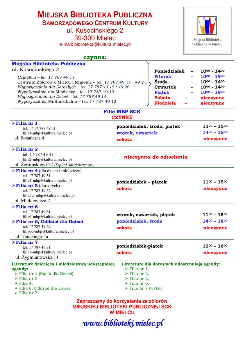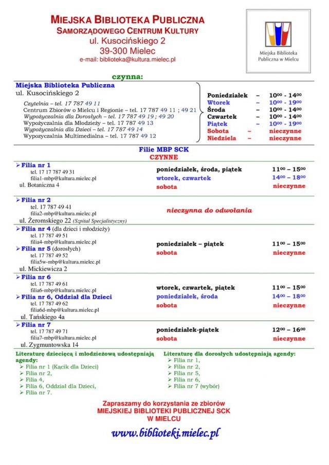 Szczegółowe informacje o zasadach funkcjonowania Biblioteki znajdują się na stronie internetowej www.biblioteki.mielec.pl
