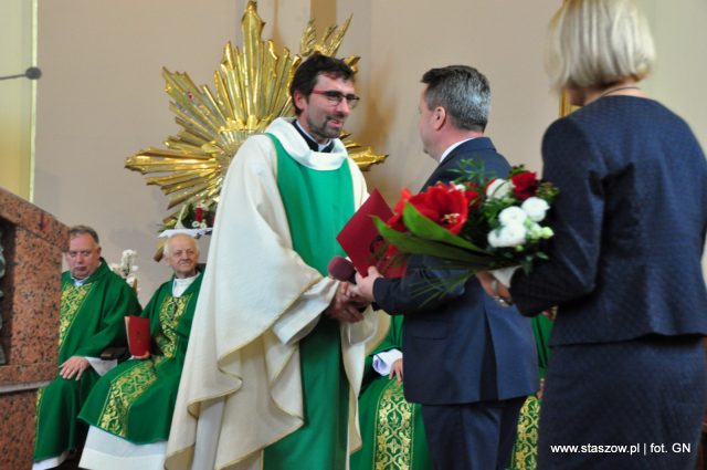 Następnie burmistrz zwrócił się do nowego księdza proboszcza. – Księże proboszczu, cieszymy się, że możemy księdza dziś przywitać w naszej staszowskiej parafii. Wiemy, że ta diecezja jest dobrze poukładana. Mieszkańcy tworzą wspaniałą wspólnotę. Wiemy, że przed księdzem duże wyzwanie, ponieważ poprzedni proboszcz był z wiernymi od początku istnienia parafii. Życzymy, aby czuł się Ksiądz dobrze w naszej wspólnocie, otoczony życzliwością, zrozumieniem i wsparciem oraz aby nigdy nie zabrakło wytrwałości i odwagi w pełnieniu posługi duszpasterskiej – mówił włodarz. Burmistrz Leszek Kopeć wyraził także nadzieję na dobrą współpracę parafii z miastem i ze swojej strony zadeklarował wszelką pomoc, jakiej ksiądz proboszcz będzie potrzebował.