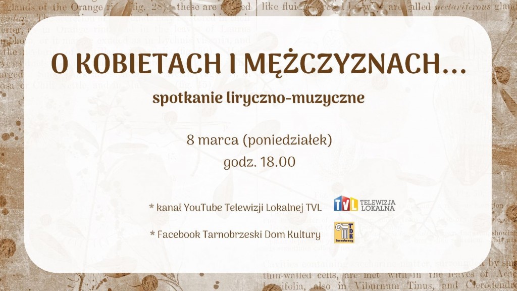 O kobietach, mężczyznach, relacjach, miłości i pragnieniach – Tarnobrzeski Dom Kultury we współpracy z Telewizją Lokalną TVL przygotował program w klimacie retro, który będzie można obejrzeć wieczorem 8 marca. Będzie można usłyszeć piosenki Agnieszki Osieckiej, wiersze Wisławy Szymborskiej i Zuzanny Ginczanki, a także utwory instrumentalne. Organizatorzy zapewniają, że program będzie nietypowy i nieco z przymrużeniem oka.