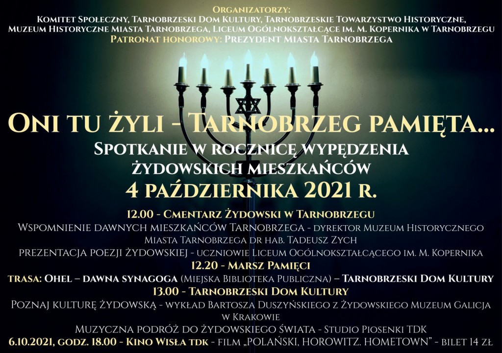 W rocznicę tych wydarzeń odbędzie się spotkanie na Cmentarzu Żydowskim, gdzie dyrektor Muzeum Historycznego Miasta Tarnobrzega dr hab. Tadeusz Zych opowie o dawnych mieszkańcach miasta, a uczniowie LO im. M. Kopernika zaprezentują żydowską poezję. Następnie uczestnicy przejdą pod dawną synagogę, a potem do TDK-u. Tu będzie można posłuchać wykładu o kulturze żydowskiej, który wygłosi Bartosz Duszyński z Muzeum Żydowskiego Galicja w Krakowie. Wieczór zakończy występ wokalistek Studia Piosenki TDK, które zaprezentują żydowskie melodie.