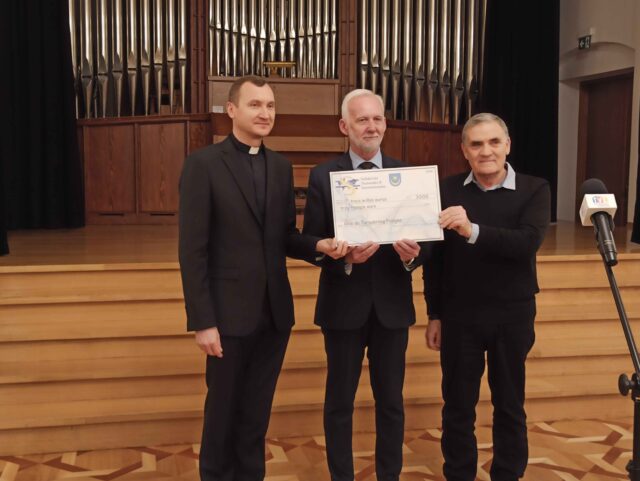 Zastępca burmistrza Pont-á-Mousson, prezes Stowarzyszenia Solidarności Narodowej i Międzynarodowej Jean Francois Moutet wręczył czek w wysokości trzech tysięcy euro goszczącemu w Tarnobrzegu proboszczowi parafii pod wezwaniem Ducha Świętego w Maniewiczach, na ukraińskim Wołyniu, księdzu Jarosławowi Rudemu.