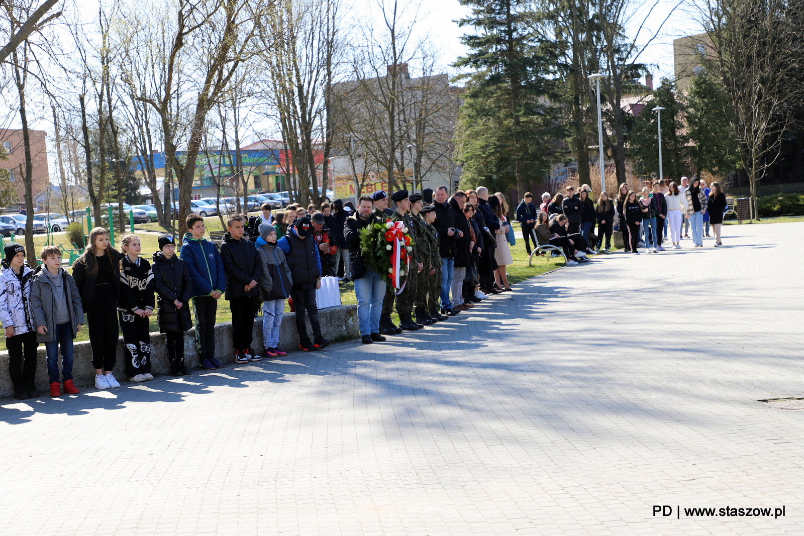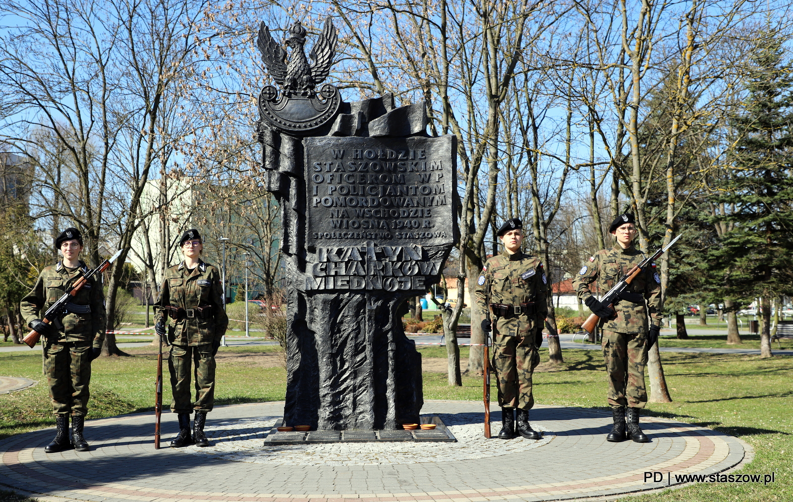 Kwiaty pod Pomnikiem Katyńskim złożyli: Leszek Kopeć – burmistrz miasta i gminy Staszów, dr Ewa Kondek – zastępca burmistrza, Paweł Krakowiak – radny Sejmiku Województwa Świętokrzyskiego, Józef Żółciak – starosta staszowski, Leszek Guzal – wicestarosta staszowski, Ireneusz Kwiecjasz – przewodniczący Rady Miejskiej w Staszowie wraz z Radnymi, Krystyna Semrau – członek Zarządu Powiatu w Staszowie, ks. kan. Edward Zieliński, Grzegorz Orzechowski – prezes Przedsiębiorstwa Gospodarki Komunalnej i Mieszkaniowej w Staszowie, Jacek Marek – prezes Zakładu Energetyki Cieplnej w Staszowie, Anna Karasińska – dyrektor Liceum Ogólnokształcącego im. ks. kard. S. Wyszyńskiego wraz z Anicetą Wójcik – wicedyrektorem szkoły oraz st. insp. Edwardem Drózdem i insp. Markiem Morawskim z Jednostki Strzeleckiej 2151 Staszów im. 2 Pułku Piechoty Legionów ZS „Strzelec” oraz delegacje szkół podstawowych i przedszkoli z gminy Staszów. Złożenie kwiatów oraz zapalenie zniczy w hołdzie pomordowanym obywatelom Rzeczypospolitej poprzedziła modlitwa w intencji bohaterów.