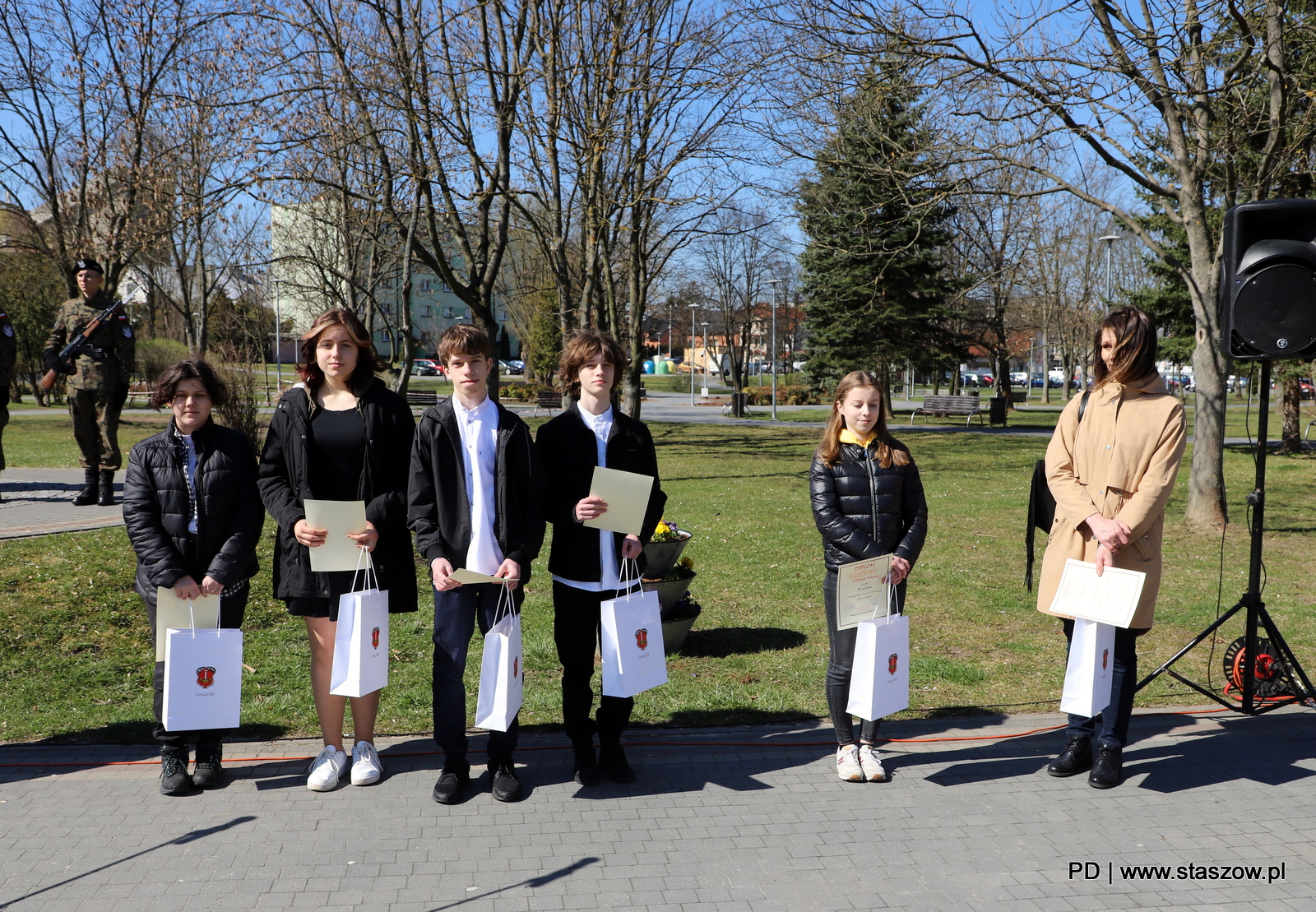 – Co roku, 13 kwietnia, w szczególny sposób czcimy pamięć tych, którzy padli ofiarą okrutnej, komunistycznej zbrodni. Zbrodni przeciwko pokojowi i ludzkości. Ten akt ludobójstwa, którego dopuścili się Sowieci, trwa w naszej pamięci, jako bolesna rana, dlatego spotykamy się tutaj dzisiaj, przy Pomniku Katyńskim, aby oddać cześć naszym przodkom, którzy w bestialski sposób stracili życie z rąk funkcjonariuszy NKWD – powiedział burmistrz Staszowa. – Pamięć o Katyniu to nasz moralny obowiązek, to nasze zobowiązanie. Dziękuję Wam, wszystkim za to, że jesteśmy tutaj razem i że chwilą modlitwy i zadumy możemy wspólnie oddać hołd ofiarom rosyjskich zbrodniarzy – podsumował włodarz, który podziękował również strzelcom z ZS „Strzelec”, działającym przy staszowskim liceum, za pełnienie warty honorowej. Rozstrzygnięto także konkursy katyńskie, zorganizowane w szkołach, a nagrodzonym wręczono upominki. Uczniowie „dwójki” przygotowali okolicznościowy montaż słowno-muzyczny.