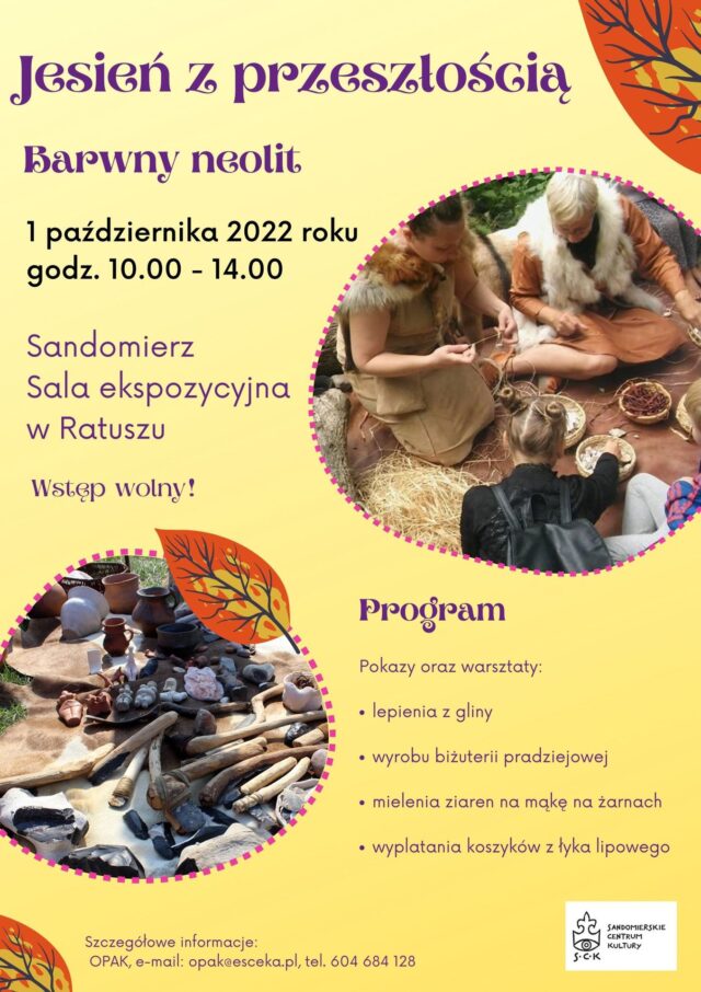 Sandomierskie Centrum Kultury zaprasza na pierwsze spotkanie z cyklu „Jesień z przeszłością”, które poświęcone będzie epoce neolitu. Wszystkich pasjonatów archeologii i historii zapraszamy w sobotę 1 października w godz. 10.00-14.00 do sali ekspozycyjnej w Ratuszu. Odbędą się tam m.in. warsztaty lepienia glinianych naczyń, wyrobu biżuterii pradziejowej, mielenia ziaren na mąkę na żarnach, wyplatania koszyków z łyka lipowego. Wstęp wolny! Szczegóły na plakacie wydarzenia.